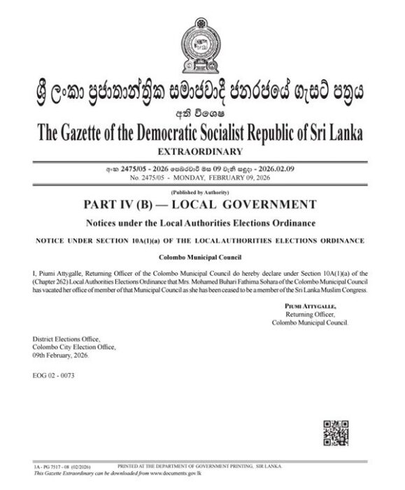 உள்ளூர் அதிகார சபைத் தேர்தல்கள் கட்டளைச் சட்டத்தின் பிரிவு 10A(1)(a) இன் கீழ், கொழும்பு மாநகர சபையின் திருமதி முகமது புஹாரி பாத்திமா சொஹாரா, ஸ்ரீலங்கா முஸ்லிம் காங்கிரஸின் உறுப்பினராக இருந்து நீக்கப்பட்டதால், மாநகர சபை உறுப்பினர் பதவியை ராஜினாமா செய்துள்ளார் என கொழும்பு மாநகர சபையின் தேர்தல் அதிகாரியான பியூமி அட்டிகல கையொப்பத்தில் வெளியான வர்த்தமானி அறிவித்தலில் தெரிவிக்கப்பட்டுள்ளது.