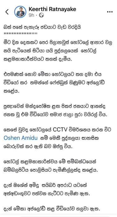 அதற்கும் மேலாக, அவர் ஹோட்டலை மிரட்டிய சம்பவத்தை வீடியோவாக பதிவு செய்து, தனது பேஸ்புக் கணக்கில் பதிவேற்றமும் செய்துள்ளார்.