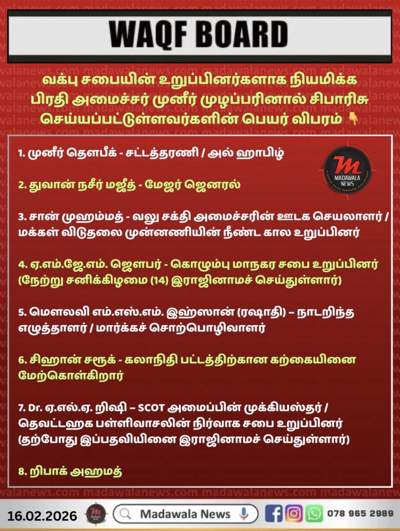 வக்பு சபையின் உறுப்பினர்களாக நியமிக்க பிரதி அமைச்சர் முனீர் முழப்பரினால் சிபாரிசு செய்யப்பட்டுள்ளவர்களின் பெயர் விபரம் 👇👇👇