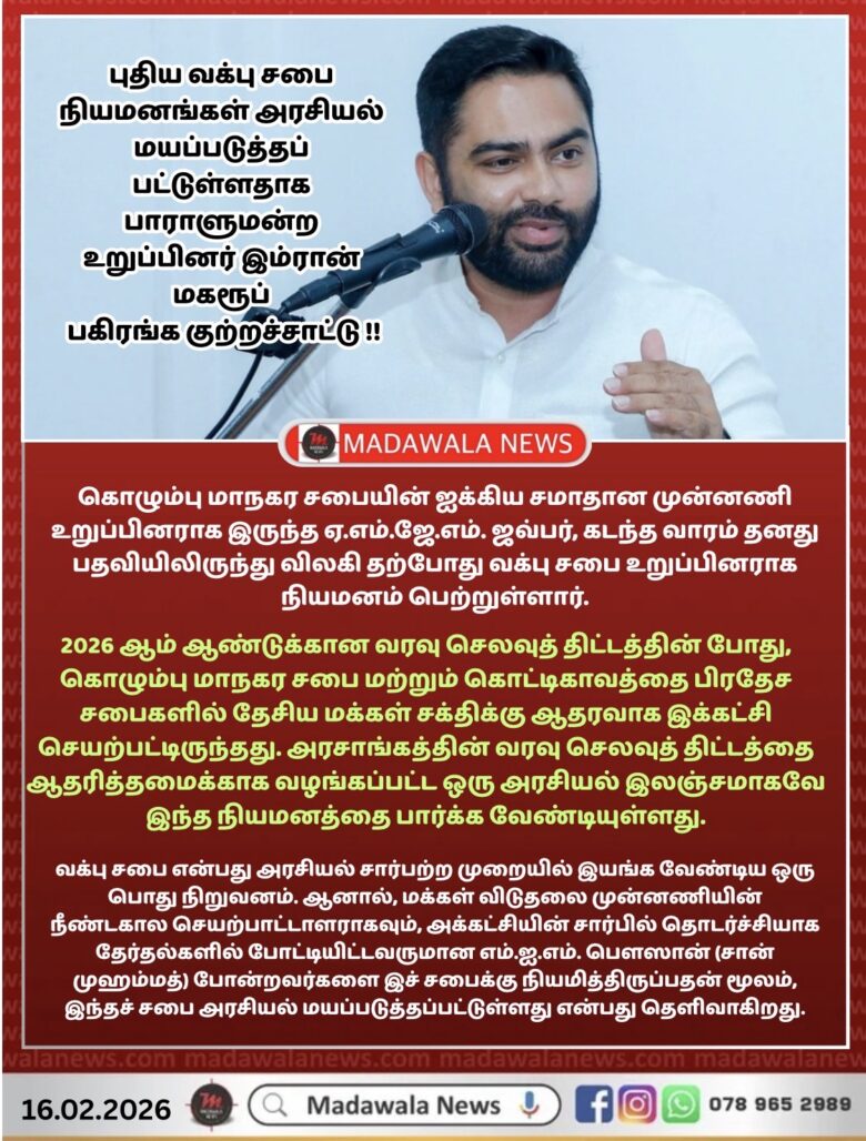 தேசிய மக்கள் சக்தி அரசாங்கத்தினால் புதிதாக நியமிக்கப்பட்டுள்ள வக்பு சபை உறுப்பினர்களின் பட்டியல், தகுதியின் அடிப்படையிலான நியமனமாக அன்றி, அரசியல் தேவைகளை பூர்த்தி செய்யும் நோக்கமாக அமைந்திருப்பதாக திருகோணமலை மாவட்ட பாராளுளுமன்ற உறுப்பினர் இம்ரான் மகரூப் கண்டனம் தெரிவித்துள்ளார்.