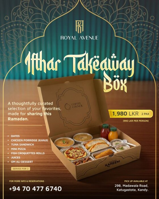 தரமான உணவு, அழகான காட்சி மற்றும் நகரின் மையப்பகுதி என அனைத்தையும் கொண்டுள்ள இந்த Coffee Council, கண்டியில் மிகவும் மலிவான விலையிலான இப்தார் அனுபவங்களில் ஒன்றாகத் திகழ்கிறது. இதன் விலை ஒரு நபருக்கு LKR 2,600 Nett ஆகும்.