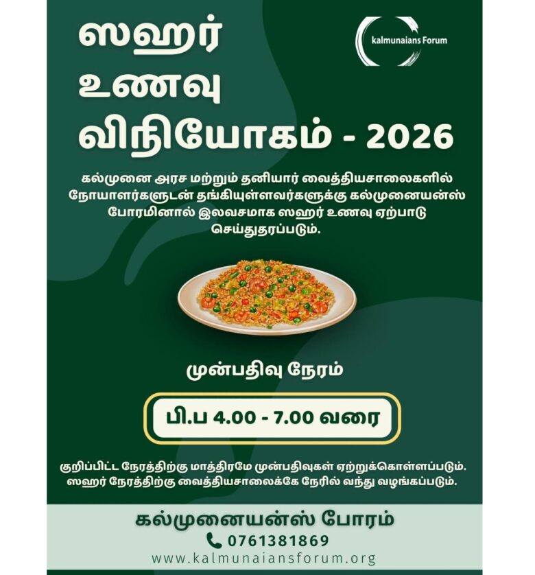 கல்முனையிலுள்ள அரச மற்றும் தனியார் வைத்தியசாலைகளில் நோயாளிகளுடன் தங்கியுள்ளவர்களுக்கும், கல்முனையில் தங்கியுள்ள வெளியூர் பயணிகளுக்கும் ஸஹர் உணவு இலவசமாக ஏற்பாடு செய்துதரப்படும்.
