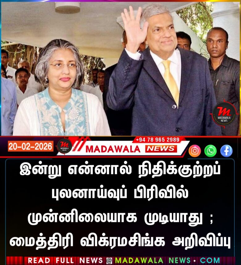 முன்னாள் ஜனாதிபதி ரணில் விக்ரமசிங்கவின் மனைவியான முன்னாள் முதல் பெண்மணி மைத்திரி விக்ரமசிங்க, இன்று (பெப்ரவரி 20) குற்றப்புலனாய்வுத் திணைக்களத்தின் (CID) நிதிக்குற்றப் புலனாய்வுப் பிரிவில் முன்னிலையாக முடியாது என அறிவித்துள்ளார்.