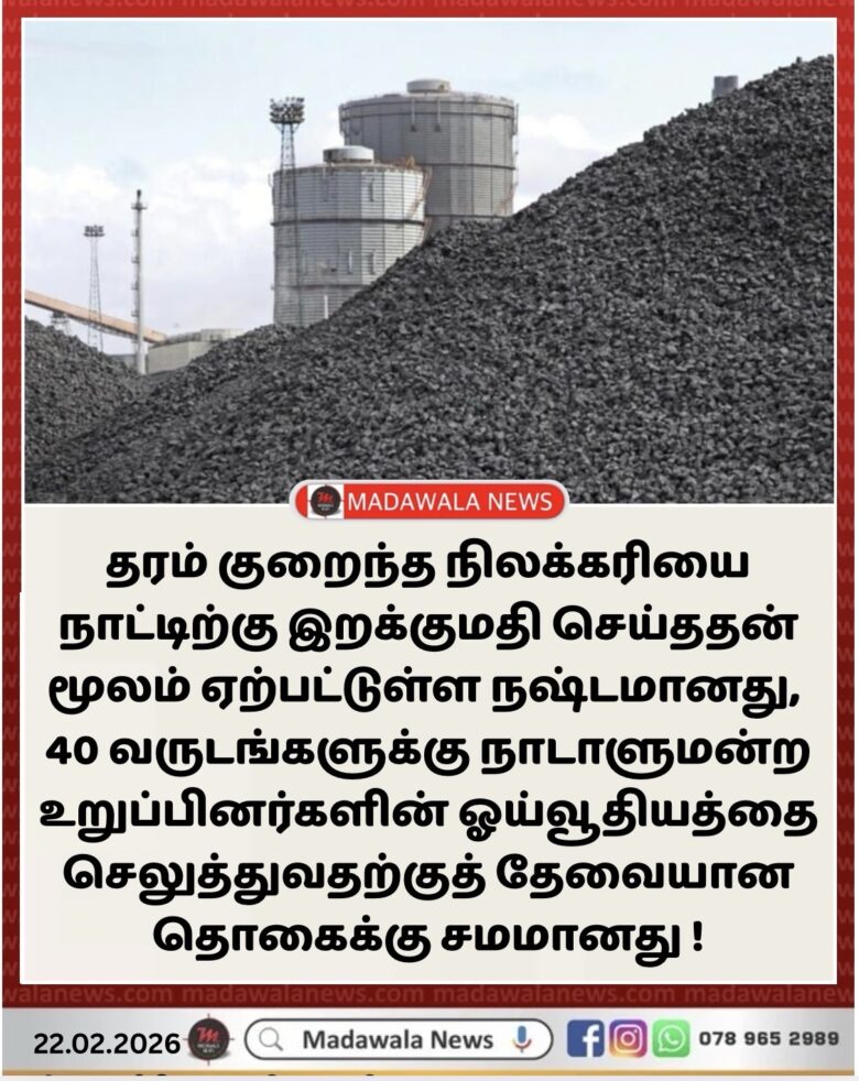 தரம் குறைந்த நிலக்கரியை நாட்டிற்கு இறக்குமதி செய்ததன் மூலம் ஏற்பட்டுள்ள நஷ்டமானது, 40 வருட காலப்பகுதியில் நாடாளுமன்ற உறுப்பினர்களின் ஓய்வூதியத்தை செலுத்துவதற்குத் தேவையான தொகைக்கு சமமானது என முன்னிலை சோசலிசக் கட்சி தெரிவித்துள்ளது.