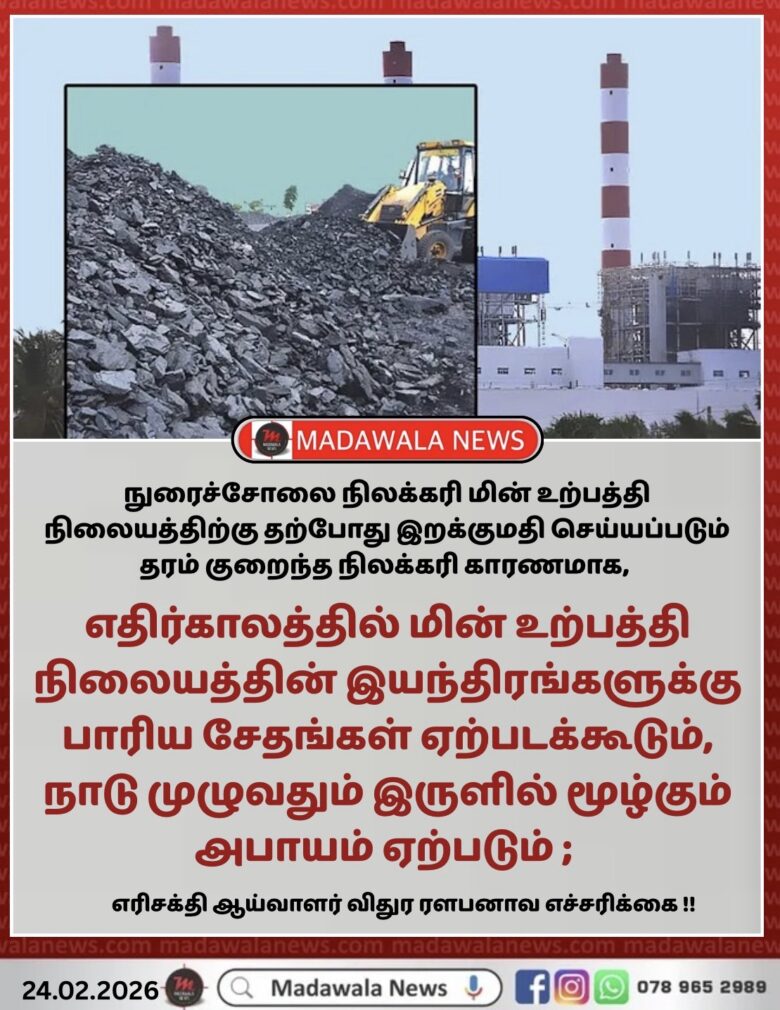 “நுரைச்சோலை நிலக்கரி மின் உற்பத்தி நிலையத்திற்கு தற்போது இறக்குமதி செய்யப்படும் தரம் குறைந்த நிலக்கரி காரணமாக, எதிர்காலத்தில் மின் உற்பத்தி நிலையத்தின் இயந்திரங்களுக்கு பாரிய சேதங்கள் ஏற்படக்கூடும் என்றும், நாடு முழுவதும் இருளில் மூழ்கும் அபாயம் காணப்படுவதாகவும் எரிசக்தி ஆய்வாளர் விதுர ரளபனாவ தெரிவித்துள்ளார்.