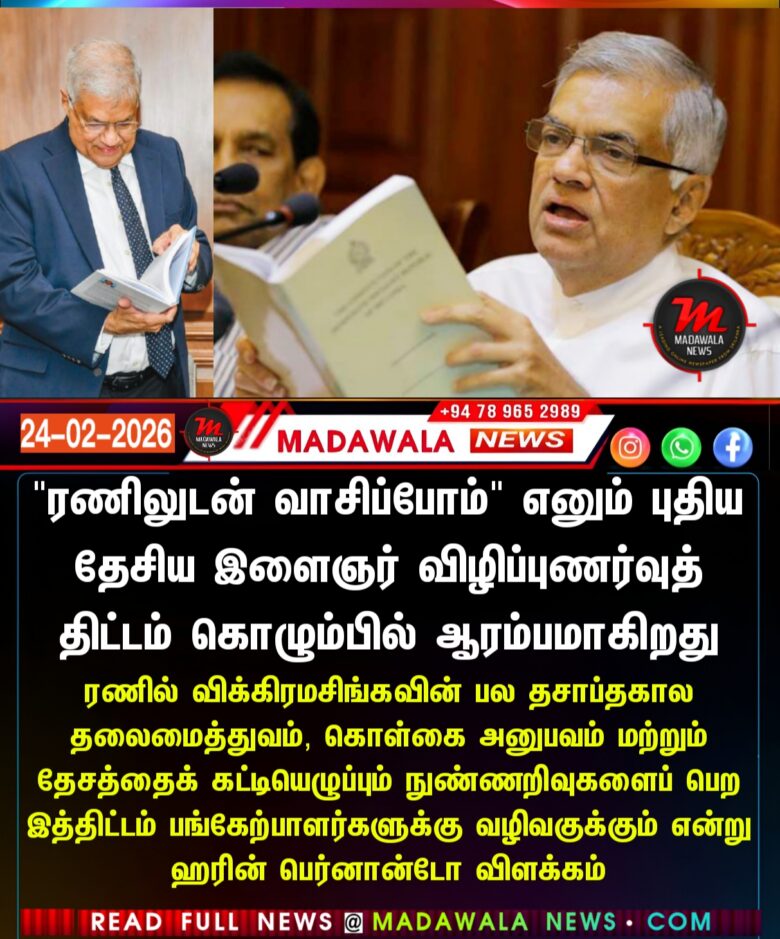 “ரணிலுடன் வாசிப்போம்” என்பது வெறும் கலந்துரையாடல் தளம் மட்டுமல்ல, இலங்கையின் எதிர்காலத்திற்கு அர்த்தமுள்ள பங்களிப்பை வழங்கக்கூடிய தகவலறிந்த, சிந்தனைமிக்க மற்றும் பொறுப்புள்ள இளம் தலைவர்களை உருவாக்குவதை நோக்கமாகக் கொண்ட ஒரு தலைமைத்துவ மேம்பாட்டுப் பாதையாகும் என்றும் அவர் சுட்டிக்காட்டினார்.