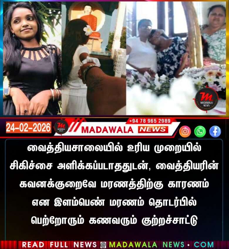 மினுவாங்கொடை ஆதார வைத்தியசாலையில் தனது மகளுக்கு உரிய முறையில் சிகிச்சை அளிக்கப்படாததுடன், வைத்தியரின் கவனக்குறைவே அவரது மரணத்திற்கு காரணம் எனப் பெற்றோர் குற்றம் சுமத்துகின்றனர்.