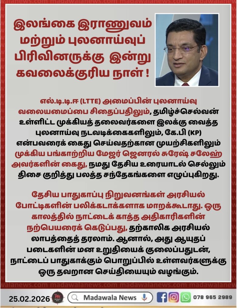 இலங்கை இராணுவம் மற்றும் புலனாய்வுப் பிரிவினருக்கு இது ஒரு கவலைக்குரிய நாள். எல்.டி.டி.ஈ (LTTE) அமைப்பின் புலனாய்வு வலையமைப்பை சிதைப்பதிலும், தமிழ்ச்செல்வன் உள்ளிட்ட முக்கியத் தலைவர்களை இலக்கு வைத்த புலனாய்வு நடவடிக்கைகளிலும், கே.பி (KP) என்பவரைக் கைது செய்வதற்கான முயற்சிகளிலும் முக்கிய பங்காற்றிய மேஜர் ஜெனரல் சுரேஷ் சல்லே அவர்களின் கைது, நமது தேசிய உரையாடல் செல்லும் திசை குறித்து பலத்த சந்தேகங்களை எழுப்புகிறது.