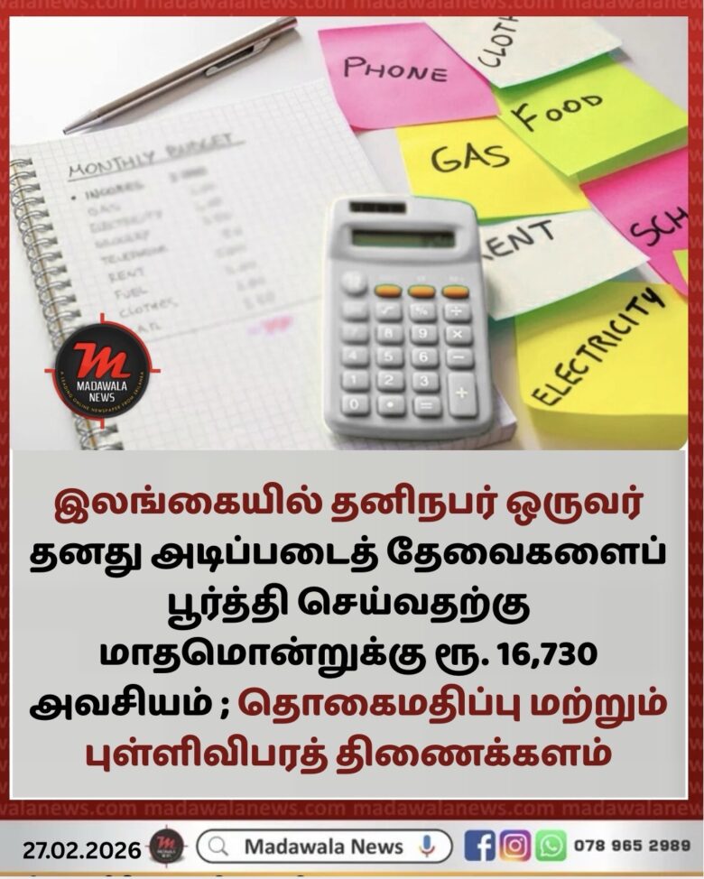 இந்த ஆண்டின் ஆரம்ப மாத நிலவரப்படி, இலங்கையில் தனிநபர் ஒருவர் தனது அடிப்படைத் தேவைகளைப் பூர்த்தி செய்வதற்கு மாதமொன்றுக்கு ரூ. 16,730 அவசியமென தொகைமதிப்பு மற்றும் புள்ளிவிபரத் திணைக்களம் தெரிவித்துள்ளது.