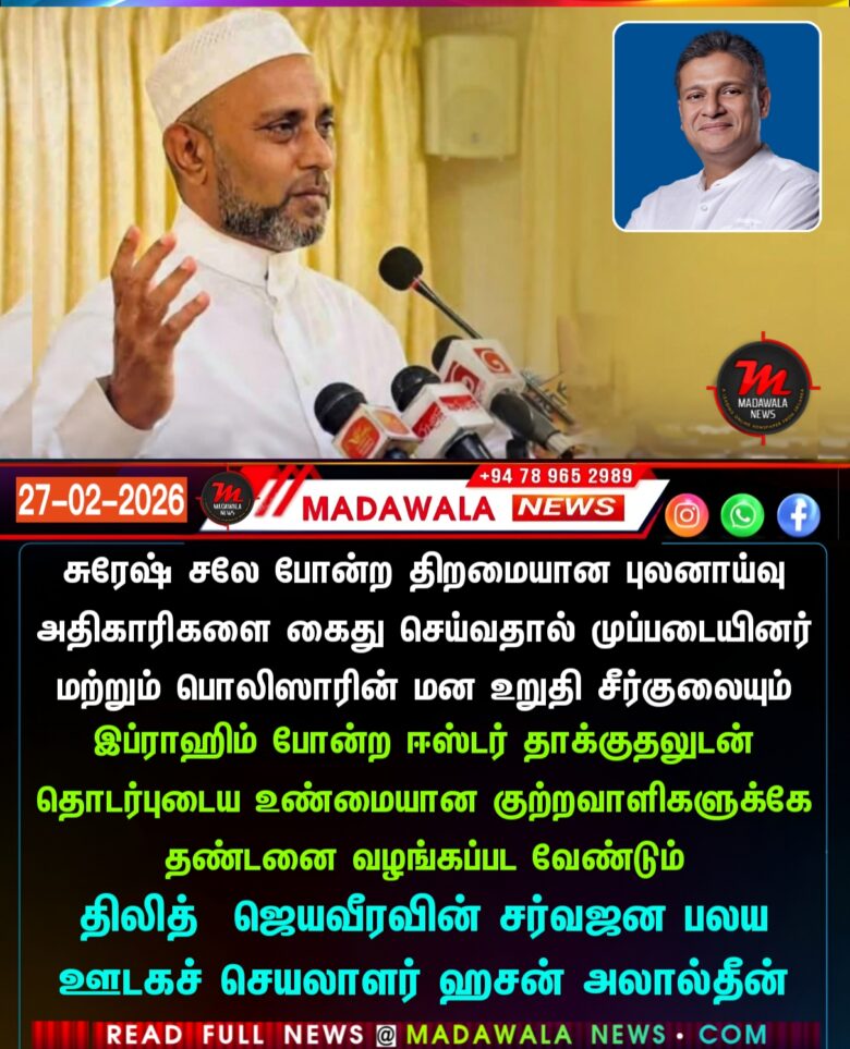 சுரேஷ் சலே போன்ற திறமையான புலனாய்வு அதிகாரிகளை கைது செய்வதால் முப்படையினர் மற்றும் பொலிஸாரின் மன உறுதி சீர்குலையும் – இப்ராஹிம் போன்ற ஈஸ்டர் தாக்குதலுடன் தொடர்புடைய உண்மையான குற்றவாளிகளுக்கே தண்டனை வழங்கப்பட வேண்டும் ; திலித் ஜெயவீரவின் சர்வஜன பலய ஊடகச் செயலாளர் ஹசன் அலால்தீன்