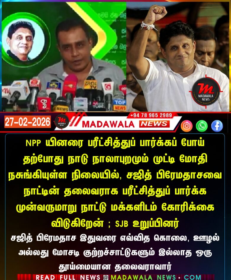 NPP யினரை பரீட்சித்துப் பார்க்கப் போய் தற்போது நாடு நாலாபுறமும் முட்டி மோதி நசுங்கியுள்ள நிலையில், சஜித் பிரேமதாசவை நாட்டின் தலைவராக பரீட்சித்துப் பார்க்க முன்வருமாறு நாட்டு மக்களிடம் கோரிக்கை விடுகிறேன் ; SJB உறுப்பினர்