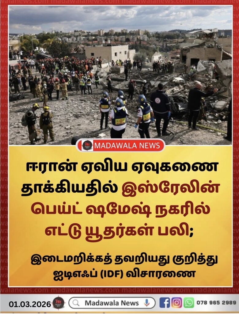 ஈரான் ஏவிய ஏவுகணை ஒன்று இஸ்ரேலின் பெய்ட் ஷமேஷ் (Beit Shemesh) நகருக்குள் ஊடுருவித் தாக்கியதில் எட்டு பேர் உயிரிழந்துள்ளனர்.
