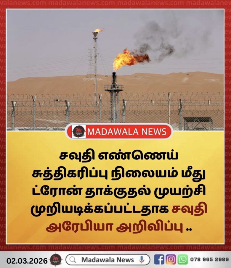 ராஸ் தனுரா (Ras Tanura) எண்ணெய் சுத்திகரிப்பு நிலையத்தை இன்று காலை “தாக்க முயன்ற” இரண்டு ட்ரோன்கள் (ஆளில்லா விமானங்கள்) இடைமறித்து அழிக்கப்பட்டதாக சவுதி அரேபிய பாதுகாப்பு அமைச்சகம் தெரிவித்துள்ளது. சவுதி அரசு நடத்தும் SPA செய்தி நிறுவனம் இந்தத் தகவலை வெளியிட்டுள்ளது.