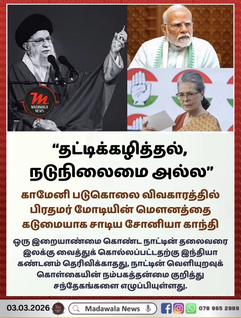 • கடுமையான விமர்சனம்: ஈரான் உச்ச தலைவர் அயதுல்லா அலி காமேனி படுகொலை செய்யப்பட்ட விவகாரத்தில், மத்திய அரசு காட்டும் மௌனத்தை காங்கிரஸ் நாடாளுமன்றக் கட்சித் தலைவர் சோனியா காந்தி கடுமையாக விமர்சித்துள்ளார்.