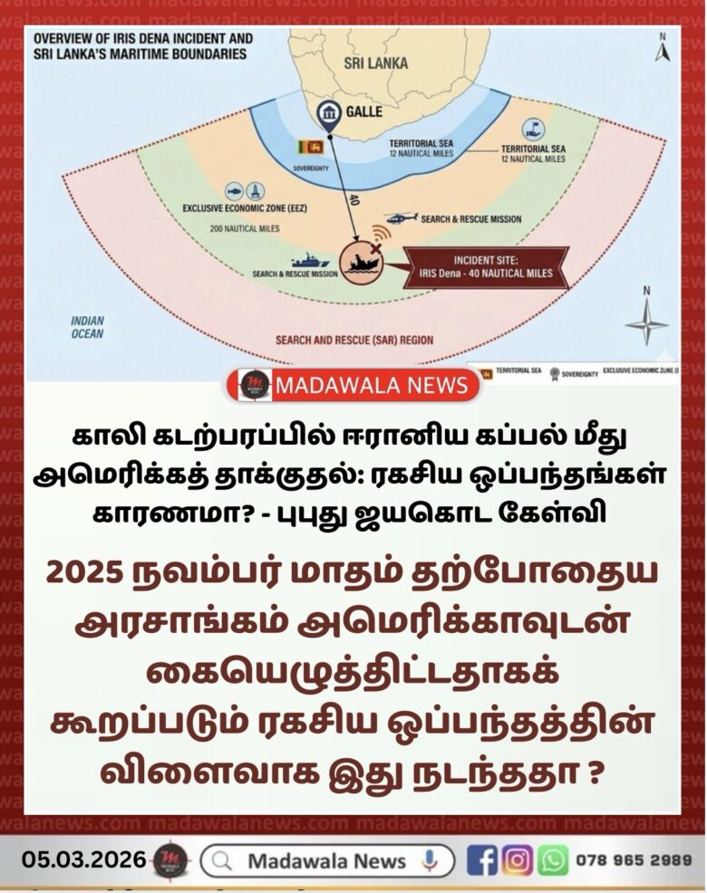 காலிக்கு அருகிலுள்ள கடற்பரப்பில் ஈரானியப் போர்க்கப்பல் மீது அமெரிக்கா நடத்திய தாக்குதல் குறித்து அரசாங்கம் உடனடியாக விளக்கமளிக்க வேண்டும் என்றும், இந்தச் சம்பவத்தின் பின்னணியில் அமெரிக்காவுடன் செய்துகொள்ளப்பட்ட ரகசிய ஒப்பந்தங்கள் உள்ளனவா என்ற சந்தேகம் எழுவதாகவும் முன்னிலை சோசலிசக் கட்சியின் அரசியல் குழு உறுப்பினர் புபுது ஜயகொட தெரிவித்துள்ளார்.