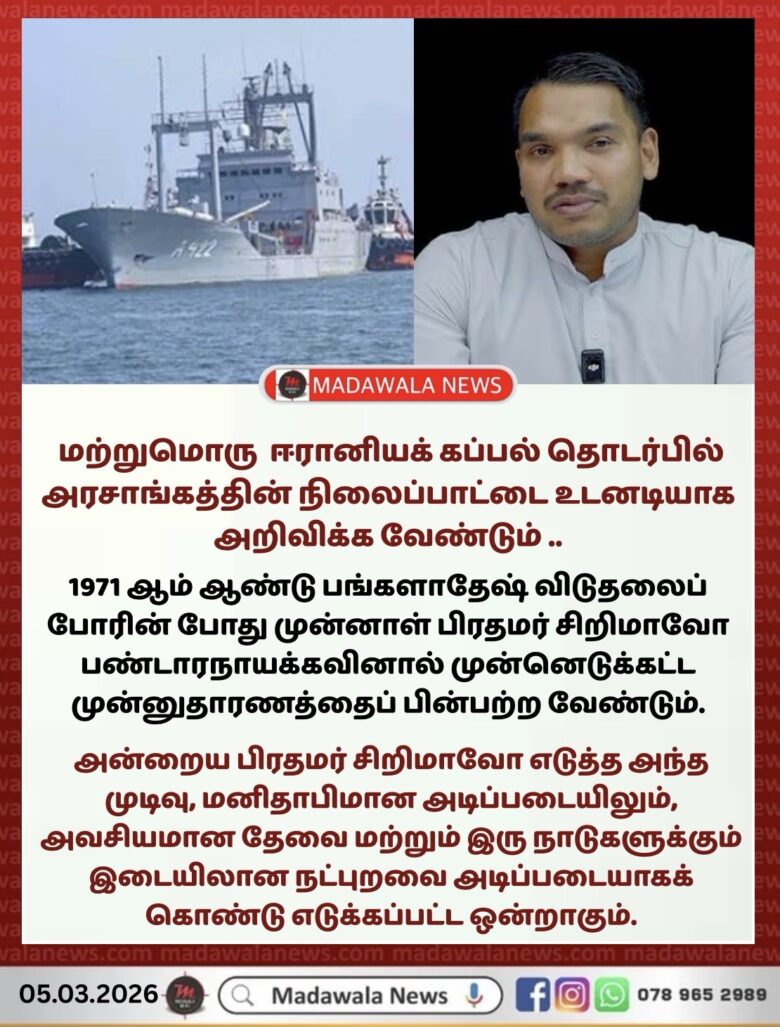 இலங்கையின் பிரத்தியேக பொருளாதார வலயத்திற்குள் இருக்கும் ஈரானியக் கப்பல் தொடர்பில் அரசாங்கத்தின் நிலைப்பாட்டை உடனடியாக அறிவிக்க வேண்டும் ..