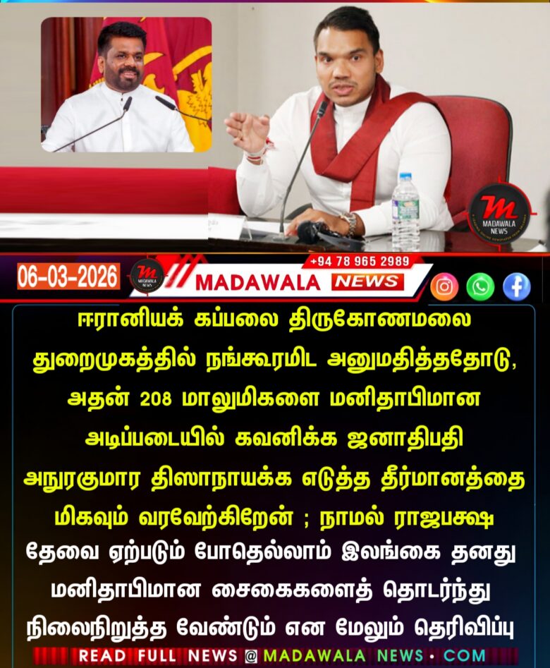 ஈரானியக் கப்பலை திருகோணமலை துறைமுகத்தில் நங்கூரமிட அனுமதித்ததோடு, அதன் 208 மாலுமிகளை மனிதாபிமான அடிப்படையில் கவனிக்க ஜனாதிபதி அநுரகுமார திஸாநாயக்க எடுத்த தீர்மானத்தை மிகவும் வரவேற்கிறேன் ; நாமல் ராஜபக்ஷ