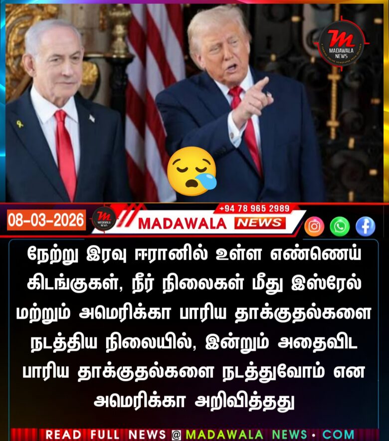 நேற்று இரவு ஈரானில் உள்ள எண்ணெய் கிடங்குகள், நீர் நிலைகள் மீது இஸ்ரேல் மற்றும் அமெரிக்கா பாரிய தாக்குதல்களை நடத்திய நிலையில் இன்றும் அதைவிட பாரிய தாக்குதல்களை நடத்துவோம் என அமெரிக்கா அறிவித்தது
