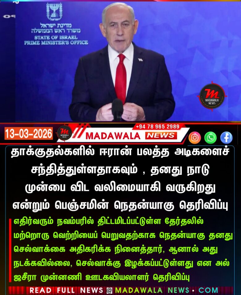 அமெரிக்காவுடன் இணைந்து ஈரான் மீது நடத்தி வரும் போர் மற்றும் கிட்டத்தட்ட இரண்டு வார காலத் தாக்குதல்களில் ஈரான் பலத்த அடிகளைச் சந்தித்துள்ளதாகவும் , தனது நாடு “முன்பை விட வலிமையாகி வருகிறது” என்றும் இஸ்ரேலிய பிரதமர் பெஞ்சமின் நெதன்யாகு உரிமை கோரியுள்ளார்.