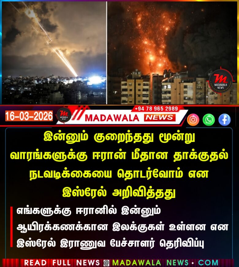 இன்னும் குறைந்தது மூன்று வாரங்களுக்கு ஈரான் மீதான தாக்குதல் நடவடிக்கையை தொடர்வோம் என இஸ்ரேல் அறிவித்தது