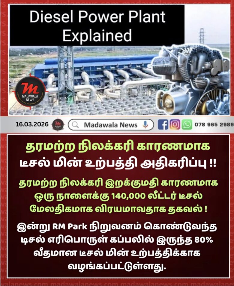 தரமற்ற நிலக்கரி இறக்குமதி காரணமாக டீசல் மின் உற்பத்தி அதிகரிக்க வேண்டிய நிலை !