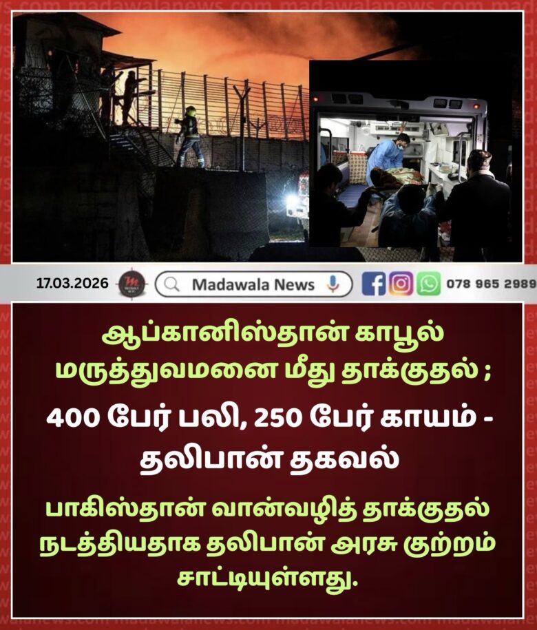 ஆப்கானிஸ்தான் காபூல் மருத்துவமனை மீது தாக்குதலில் 400 பேர் பலி, 250 பேர் காயம் – தலிபான் தகவல்