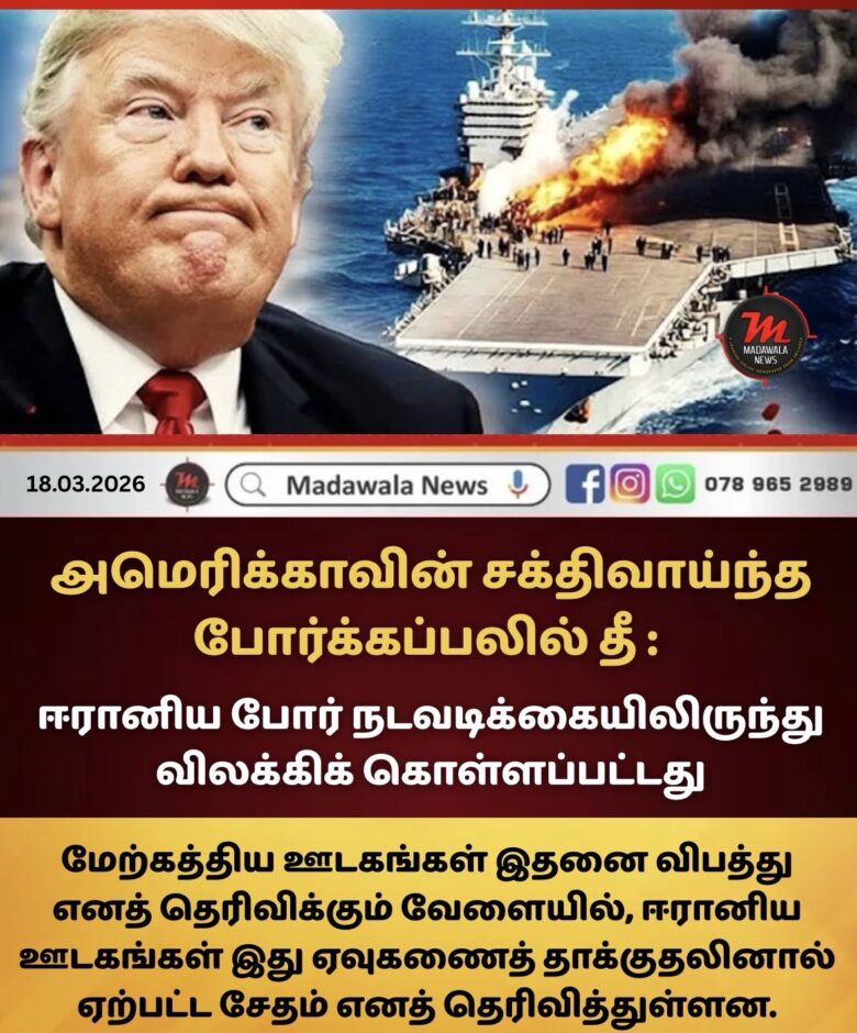 அமெரிக்காவின் சக்திவாய்ந்த போர்க்கப்பலில் தீ : ஈரானிய போர் நடவடிக்கையிலிருந்து விலக்கிக் கொள்ளப்பட்டது !