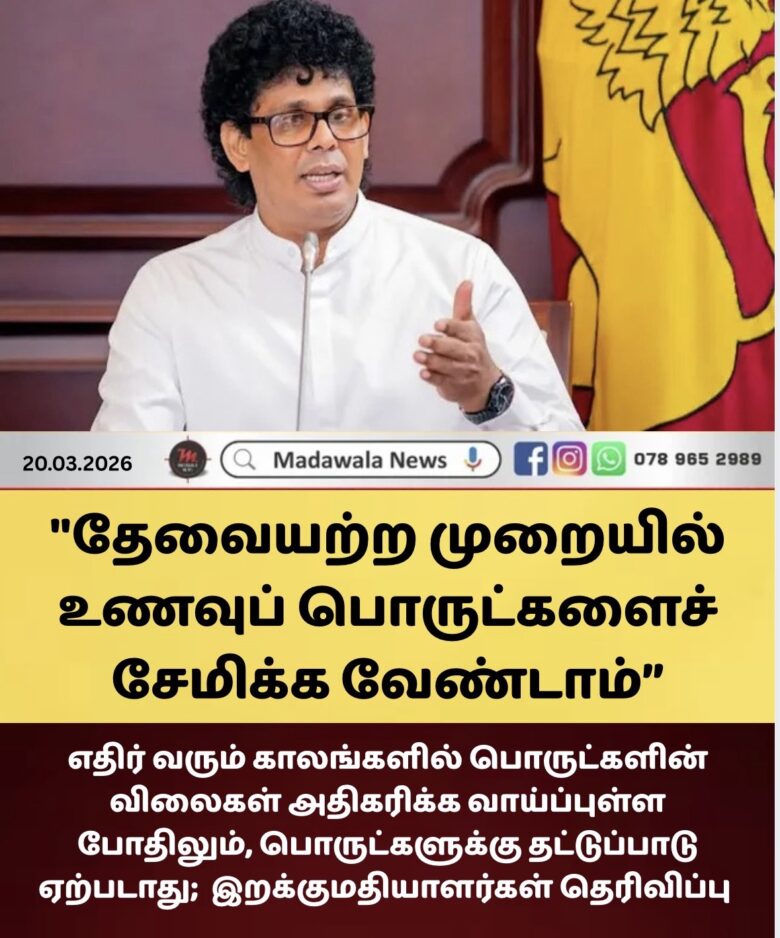 • நெத்தலி விநியோகம்: போர்ச் சூழல் காரணமாக ஈரானில் இருந்து இறக்குமதி செய்யப்படும் நெத்தலி விநியோகத்தில் பாதிப்பு ஏற்பட்டுள்ளதாக அமைச்சர் சுட்டிக்காட்டினார். அதற்குப் பதிலாக தாய்லாந்திலிருந்து நெத்தலியை இறக்குமதி செய்ய இறக்குமதியாளர்கள் ஏற்கனவே நடவடிக்கை எடுத்து வருவதாகவும் அவர் கூறினார்.