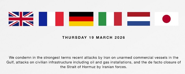 ஈரான் ஹோமுஸ் நீரிணையை மூடுவதற்கு எடுக்கும் முயற்சிகளையும், சிவில் உள்கட்டமைப்புகளை இலக்கு வைத்து நடத்தும் தாக்குதல்களையும் கண்டித்து ஐரோப்பிய நாடுகள், ஜப்பான் மற்றும் கனடா ஆகிய நாடுகள் இணைந்து கூட்டு அறிக்கையொன்றை வெளியிட்டுள்ளன.
