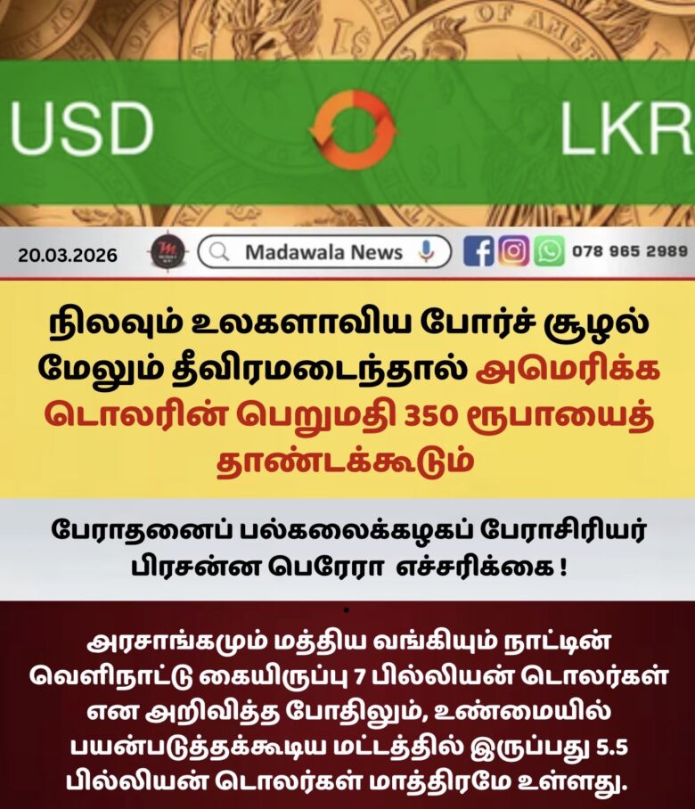 இலங்கையின் தற்போதைய பொருளாதார ஸ்திரத்தன்மை பலத்த ஆபத்தில் இருப்பதாகவும், நிலவும் உலகளாவிய போர்ச் சூழல் மேலும் தீவிரமடைந்தால் அமெரிக்க டொலரின் பெறுமதி 350 ரூபாயைத் தாண்டக்கூடும் என்றும் பேராசிரியர் பிரசன்ன பெரேரா எச்சரிக்கிறார்.