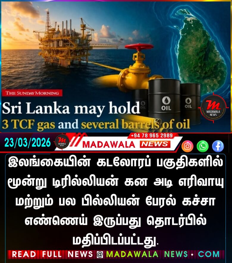 இலங்கையின் கடலோரப் பகுதிகளில் மூன்று டிரில்லியன் கன அடி எரிவாயு மற்றும் பல பில்லியன் பேரல் கச்சா எண்ணெய் இருப்பது தொடர்பில் மதிப்பிடப்பட்டது.
