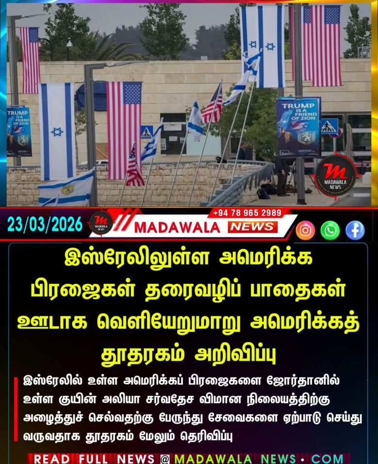 இஸ்ரேலிலுள்ள அமெரிக்க பிரஜைகள் தரைவழிப் பாதைகள் ஊடாக வெளியேறுமாறு அமெரிக்கத் தூதரகம் அறிவிப்பு