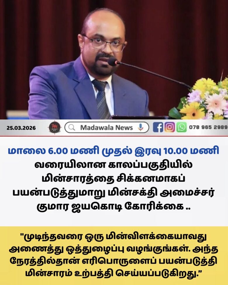 மாலை 6.00 மணி முதல் இரவு 10.00 மணி வரையிலான காலப்பகுதியில் மின்சாரத்தை சிக்கனமாகப் பயன்படுத்துமாறு மின்சக்தி அமைச்சர் குமார ஜயகொடி கோரிக்கை ..