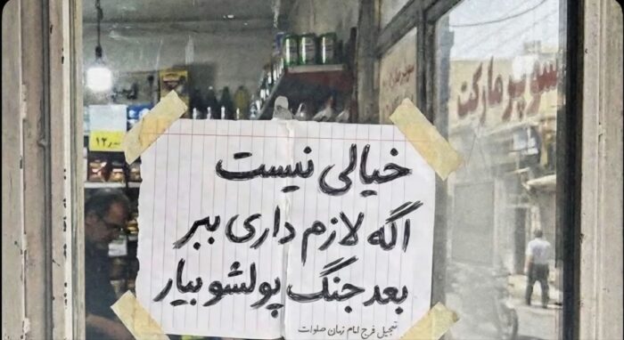 பிற்குறிப்பு – ஈரானின் பல சரக்கு கடை ஒன்றில் பொறிக்கப்பட்டுள்ள வாசகம். இங்கே உள்ள பொருட்களில் ஏதாவது ஒன்று உங்களுக்கு தேவையானால் அதை எடுத்துக் கொள்ளுங்கள். யுத்தம் முடிந்ததும் காசை கொடுத்து விடுங்கள் என்று எழுதியிருக்கிறது.