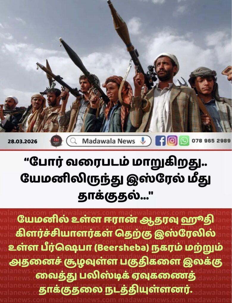 தற்போது நிலவும் மோதல் சூழலுக்கு மத்தியில், யேமனில் உள்ள ஈரான் ஆதரவு ஹூதி கிளர்ச்சியாளர்கள் தெற்கு இஸ்ரேலில் உள்ள பீர்ஷெபா (Beersheba) நகரம் மற்றும் அதனைச் சூழவுள்ள பகுதிகளை இலக்கு வைத்து பலிஸ்டிக் ஏவுகணைத் தாக்குதலை நடத்தியுள்ளனர். இந்தத் தாக்குதலைத் தொடர்ந்து, இஸ்ரேலின் தெற்கு பிராந்தியம் முழுவதும் எச்சரிக்கை சைரன் ஒலிகள் எழுப்பப்பட்டதாக தகவல்கள் தெரிவிக்கின்றன.