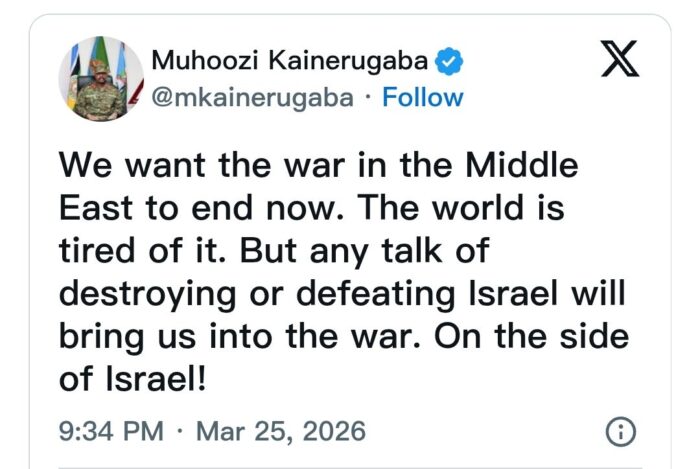 உகாண்டாவின் ராணுவத் தளபதியும், அந்நாட்டின் அதிபர் யோவேரி முசெவேனியின் மகனுமான ஜெனரல் முஹூசி கைனருகாபா, கடந்த வாரத்தில் சமூக ஊடகங்களில் வெளியிட்ட தொடர்ச்சியான பதிவுகளில், ஈரானுக்கு எதிரான போரில் இஸ்ரேலுக்கு ஆதரவளிப்பதாகவும், உகாண்டா படைகளை வழங்கத் தயார் என்றும் தெரிவித்துள்ளார்.