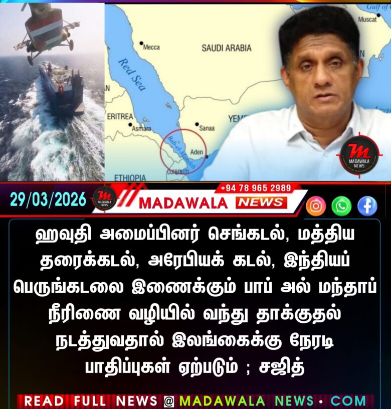 ஹவுதி அமைப்பினர் செங்கடல், மத்திய தரைக்கடல், அரேபியக் கடல், இந்தியப் பெருங்கடலை இணைக்கும் பாப் அல் மந்தாப் நீரிணை வழியில் வந்து தாக்குதல் நடத்துவதால் இலங்கைக்கு நேரடி பாதிப்புகள் ஏற்படும் ; சஜித்