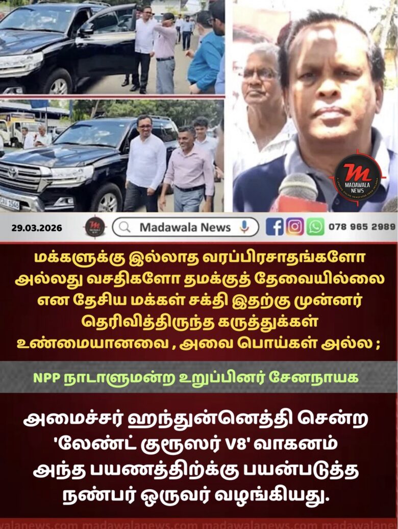 தொழில் அமைச்சர் சுனில் ஹந்துன்னெத்தி ‘லேண்ட் குரூஸர்’ (Land Cruiser) ரக சொகுசு வாகனத்தில் பொலன்னறுவைக்குச் சென்றது தொடர்பாக சமூகத்தில் எழுந்துள்ள வாதவிவாதங்கள் குறித்து, தேசிய மக்கள் சக்தியின் நாடாளுமன்ற உறுப்பினர் சேன நாநாநாயக்க கருத்து வெளியிட்டுள்ளார்.