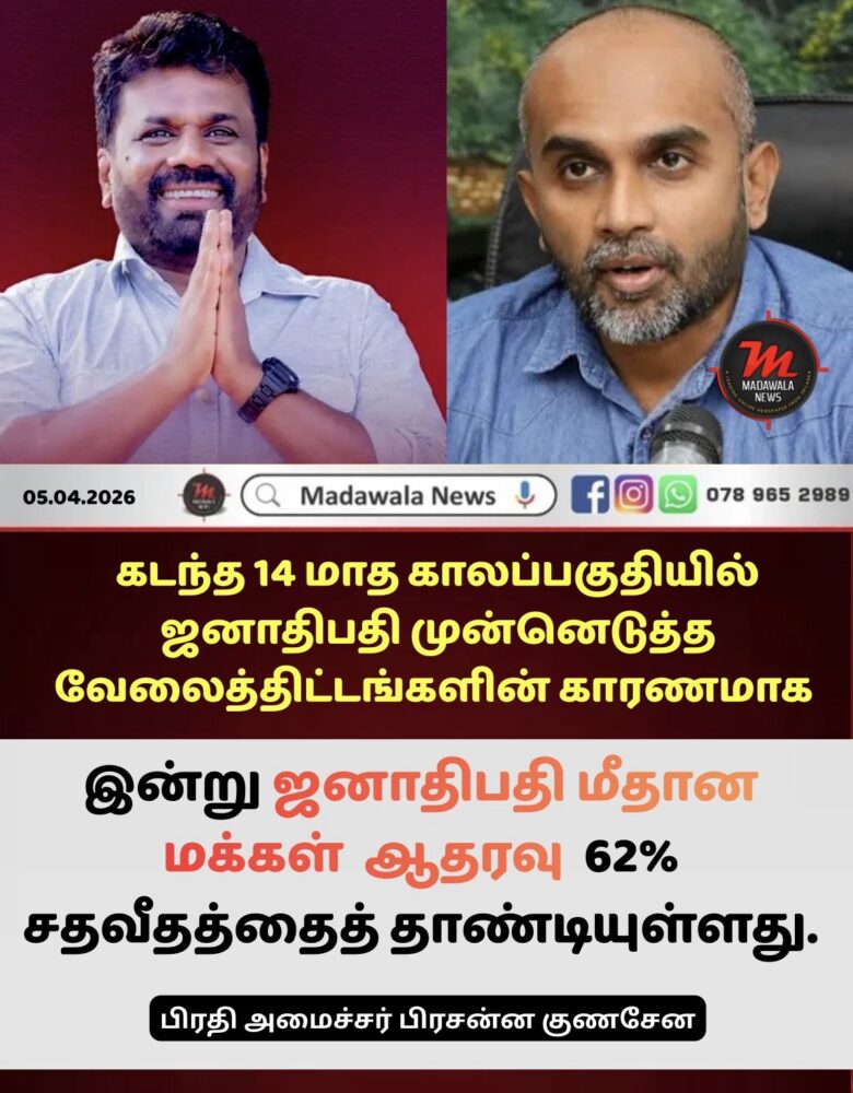 இருப்பினும், இன்று ஜனாதிபதியின் செல்வாக்கு 62% சதவீதத்தைத் தாண்டியுள்ளதாக அவர் தெரிவித்தார். கடந்த 14 மாத காலப்பகுதியில் ஜனாதிபதி முன்னெடுத்த வேலைத்திட்டங்களின் காரணமாகவே இந்த மாற்றம் ஏற்பட்டுள்ளதாகவும் அவர் சுட்டிக்காட்டினார்.
