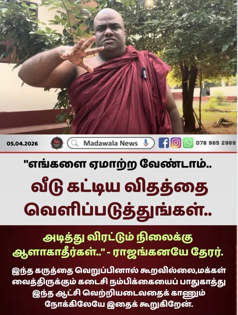 “எங்களை ஏமாற்ற வேண்டாம்.. வீடு கட்டிய விதத்தை வெளிப்படுத்துங்கள்.. அடித்து விரட்டும் நிலைக்கு ஆளாகாதீர்கள்..” – ராஜங்கனயே தேரர்.