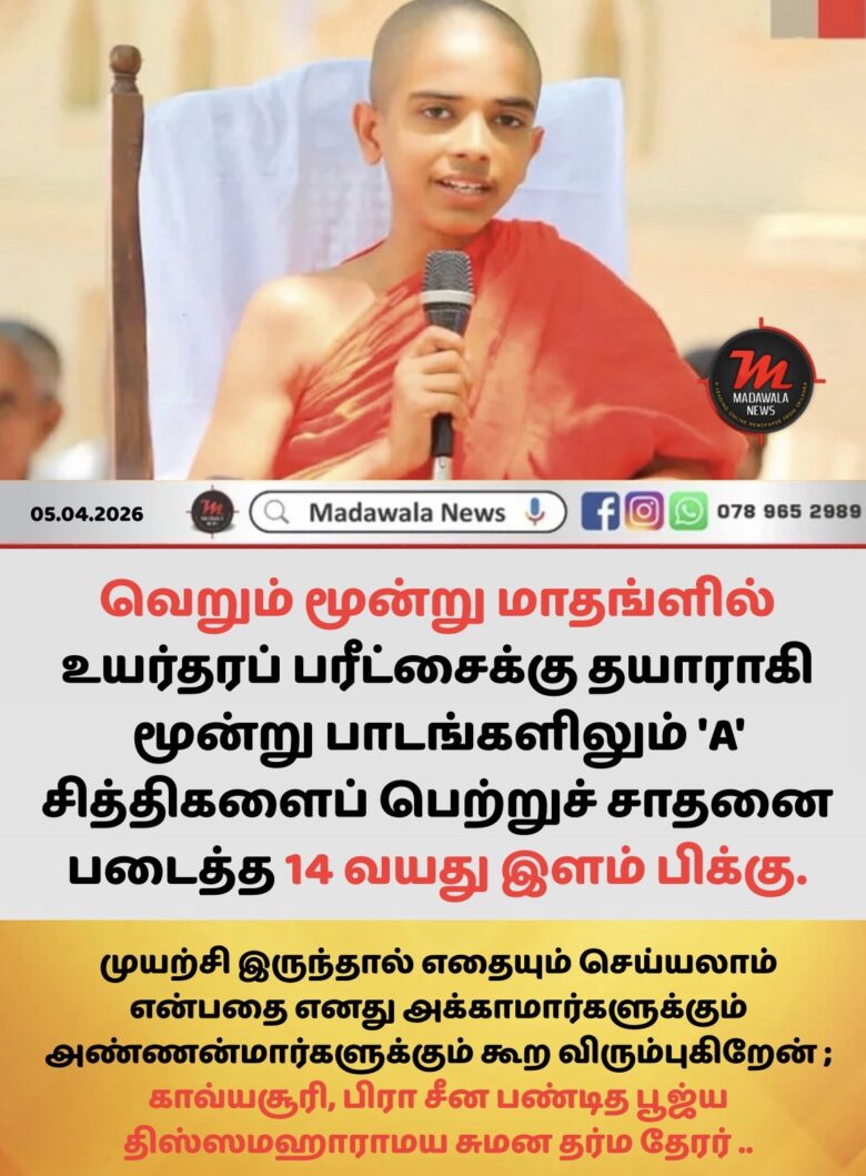 14 வயதில் உயர்தரப் பரீட்சையில் (3 A ) சித்தியடைந்த திஸ்ஸமஹாராமயவைச் சேர்ந்த இளம் பிக்கு