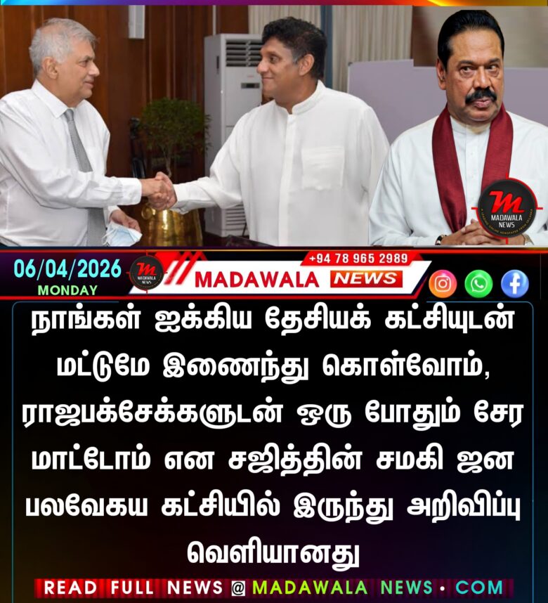 நாங்கள் ஐக்கிய தேசியக் கட்சியுடன் மட்டுமே இணைந்து கொள்வோம், ராஜபக்சேக்களுடன் ஒரு போதும் சேர மாட்டோம் என சஜித்தின் சமகி ஜன பலவேகய கட்சியில் இருந்து அறிவிப்பு வெளியானது