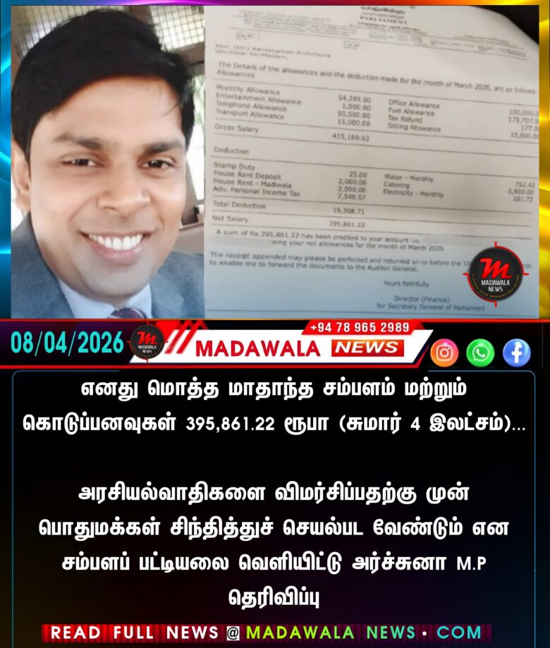 நாடாளுமன்ற உறுப்பினர்களின் வருமானம் குறித்து பொதுமக்கள் அறிந்திருக்க வேண்டும் எனக் கூறி, பாராளுமன்ற உறுப்பினர் இராமநாதன் அர்ச்சுனா தனது 2026 மார்ச் மாதத்திற்கான நாடாளுமன்ற சம்பளப் பட்டியலை பகிரங்கமாக வெளியிட்டுள்ளார்.