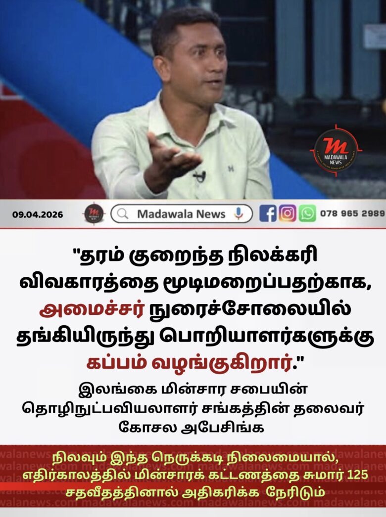 “தரம் குறைந்த நிலக்கரி விவகாரத்தை மூடிமறைப்பதற்காக, அமைச்சர் நுரைச்சோலையில் தங்கியிருந்து பொறியாளர்களுக்கு கப்பம் வழங்குகிறார்.”