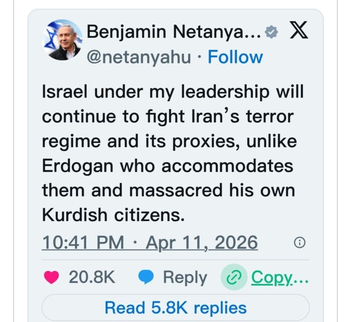 “எனது தலைமையிலான இஸ்ரேல், ஈரானின் பயங்கரவாத ஆட்சி மற்றும் அதன் பினாமிகளுக்கு எதிராக தொடர்ந்து போரிடும்,” என்று நெதன்யாகு X தளத்தில் பதிவிட்டுள்ளார். ஈரானுக்கு எர்டோகன் “இடமளிப்பதாக” குற்றம் சாட்டிய அவர், குர்திஷ் குடிமக்கள் “படுகொலை” செய்யப்பட்டதற்கும் அவரே பொறுப்பு என்றும் கூறினார்.