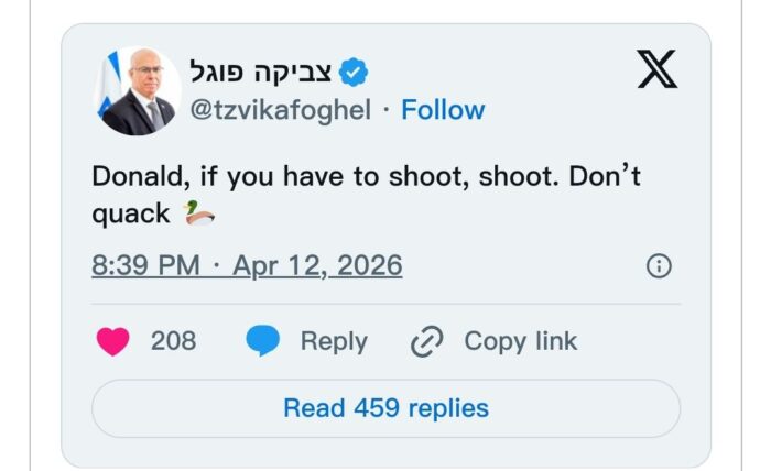 இஸ்ரேலிய நாடாளுமன்றத்தின் தேசிய பாதுகாப்பு குழுவின் தலைவரும், பெஞ்சமின் நெதன்யாகு தலைமையிலான ஆளும் கூட்டணியின் அங்கமான இடாமர் பென்-க்வீரின் தீவிரவாத யூத சக்தி கட்சியின் உறுப்பினருமான ஸ்விகா ஃபோகல், டொனால்ட் ட்ரம்ப்பிற்கு ஏளனமான செய்தி ஒன்றை வெளியிட்டுள்ளார்: