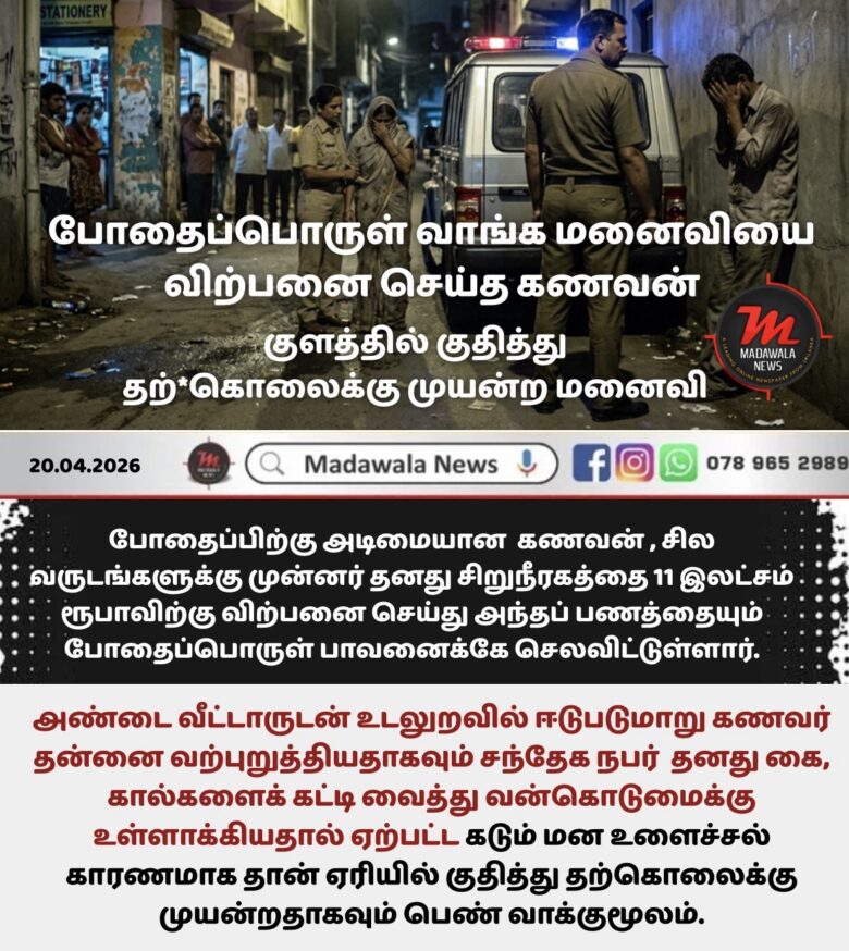 போதைப்பொருள் வாங்குவதற்குப் பணம் தேடும் நோக்கில், தனது மனைவியை அண்டை வீட்டார் ஒருவருக்கு விற்பனை செய்ததாகக் கூறப்படும் நபர் ஒருவரையும், அந்தப் பெண்ணைத் துஷ்பிரயோகம் செய்ததாகக் குற்றம் சுமத்தப்பட்ட மற்றொருவரையும் கைது செய்வதற்கு அலவதுகொட பொலிஸார் விசாரணைகளை ஆரம்பித்துள்ளனர்.