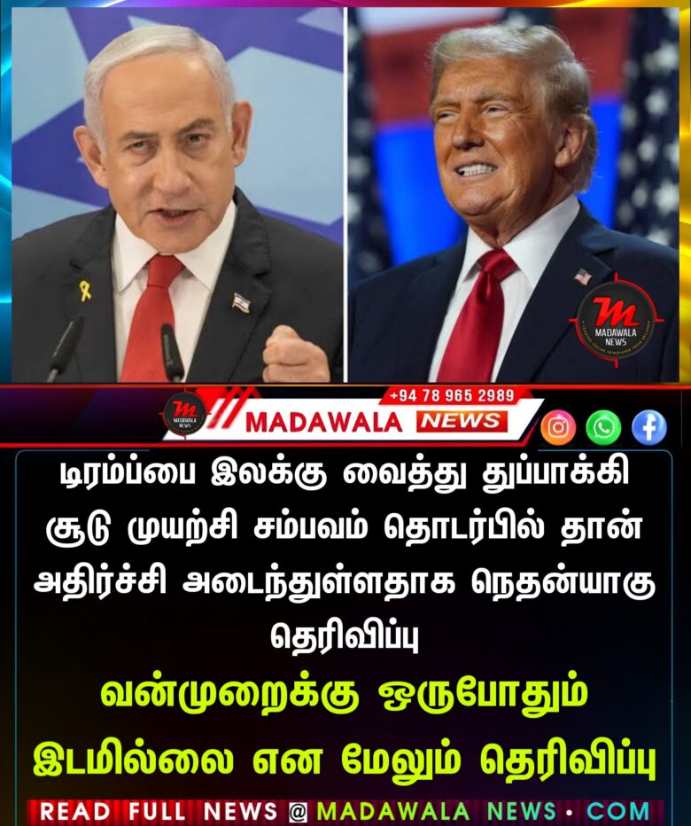 டிரம்ப்பை இலக்கு வைத்து துப்பாக்கி சூடு முயற்சி சம்பவம் தொடர்பில் தான் அதிர்ச்சி அடைந்துள்ளதாக நெதன்யாகு தெரிவிப்பு – வன்முறைக்கு ஒருபோதும் இடமில்லை என மேலும் தெரிவிப்பு