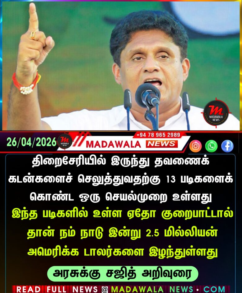 திறைசேரியில் இருந்து தவணைக் கடன்களைச் செலுத்துவதற்கு 13 படிகளைக் கொண்ட ஒரு செயல்முறை உள்ளது – இந்த படிகளில் உள்ள ஏதோ குறைபாட்டால் தான் நம் நாடு இன்று 2.5 மில்லியன் அமெரிக்க டாலர்களை இழந்துள்ளது ; அரசுக்கு சஜித் அறிவுரை