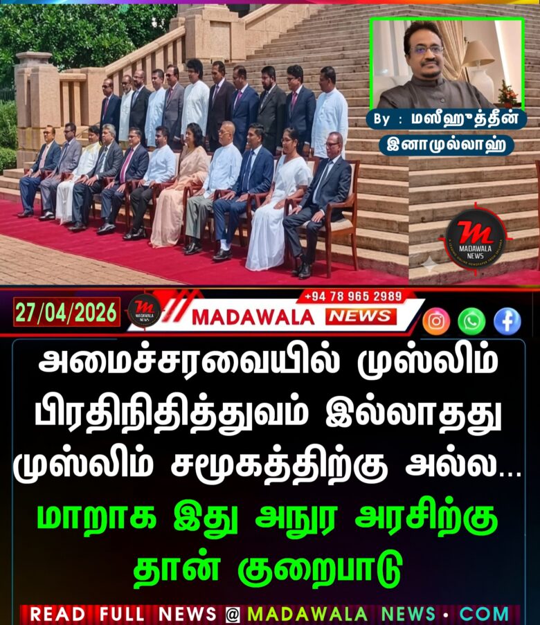தேசிய மக்கள் சக்தி அரசு முன்வைத்த தேர்தல் விஞ்ஞாபனங்கள் முதல் இன்றுவரை அது முன்னெடுத்துச் செல்லும் பாரிய பல்துறை சீர்திருத்த திட்டங்கள் அமுலாக்கங்களுக்கு அறிவுபூர்வமான ஆதரவை வழங்கி வரும் நாம் அமைச்சரவையில் நியாயமான முஸ்லிம் பிரதிநிதித்துவம் இல்லாமையை எந்த வகையிலும் நியாயப்படுத்த முடியாது என்பதனையும், அதனால் முஸ்லிம் சமூகம் இழப்பதற்கு எதுவும் இல்லா விட்டாலும் அது இந்த அரசிற்கு ஒரு பெரிய வடுவாகவே வரலாற்றில் பதியப்படும்; பட்டிருக்கிறது என்பதனையும், அதற்காக காலம் கடந்து கைசேதப்படுவார்கள் என்பதனையும் வலியுறுத்தி கூறி வைக்கிறோம்!